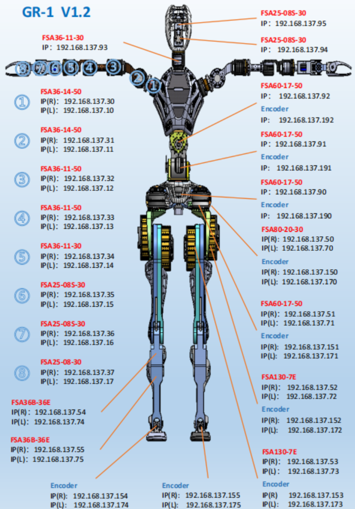 下肢: GR-1的腰部装有3个驱动器,它们与右腿串联连接;每条腿则由6个驱动器构成。所有驱动器均通过46V电源线和以太网线进行串联。我们在腿部每个主动关节均配备了一个末端绝对值编码器,用于位置检测。