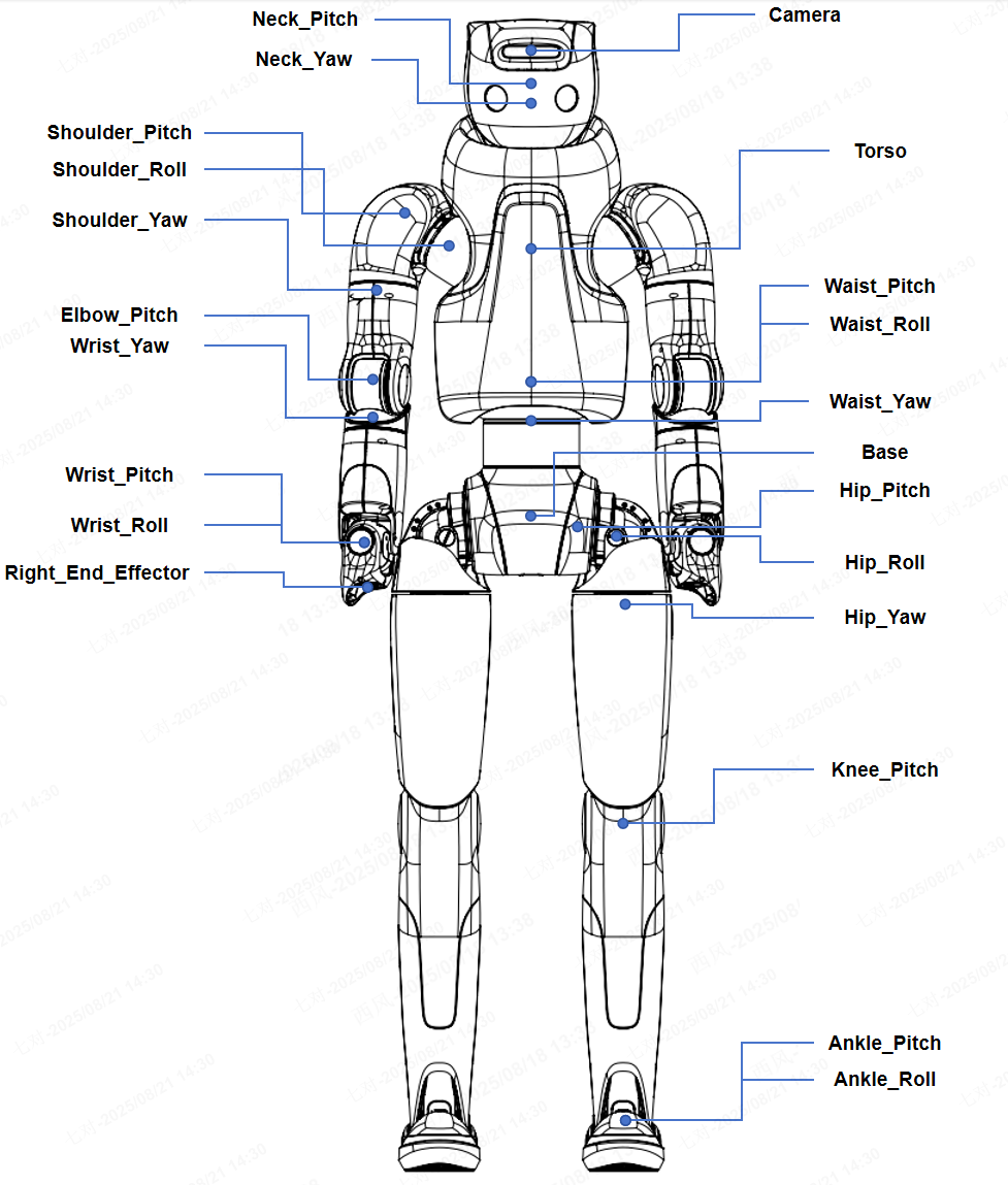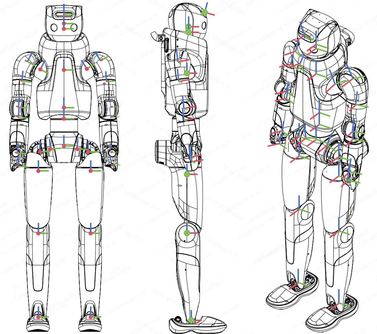 GR-3的关节旋转坐标系采用右手坐标系,各轴颜色标识如下图所示:X轴为红色,Y轴为绿色,Z轴为蓝色。同时图中也包含了关节旋转轴及零点位置信息。在坐标系中,机器人的关节旋转可分为三个基本方向:绕X轴旋转称为Roll方向,绕Y轴旋转轴为Pitch方向,绕Z轴旋转称为Yaw方向。