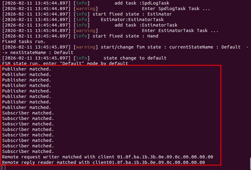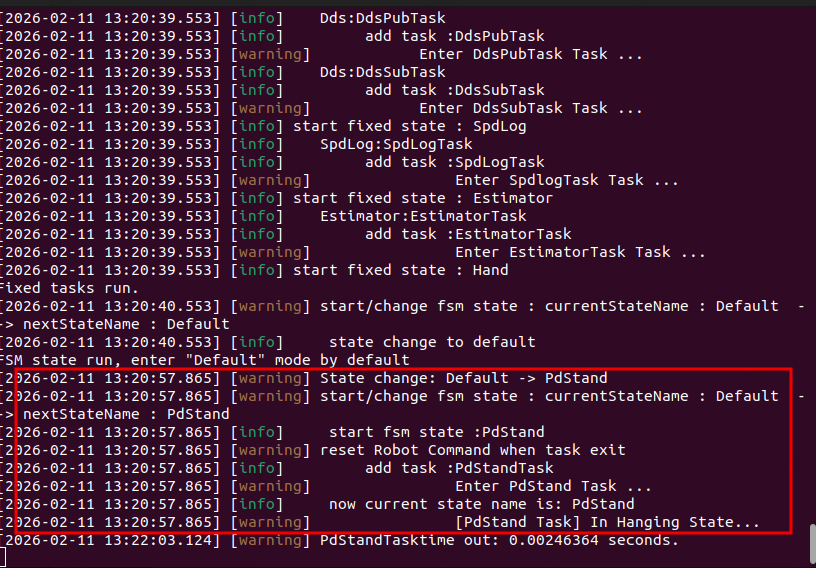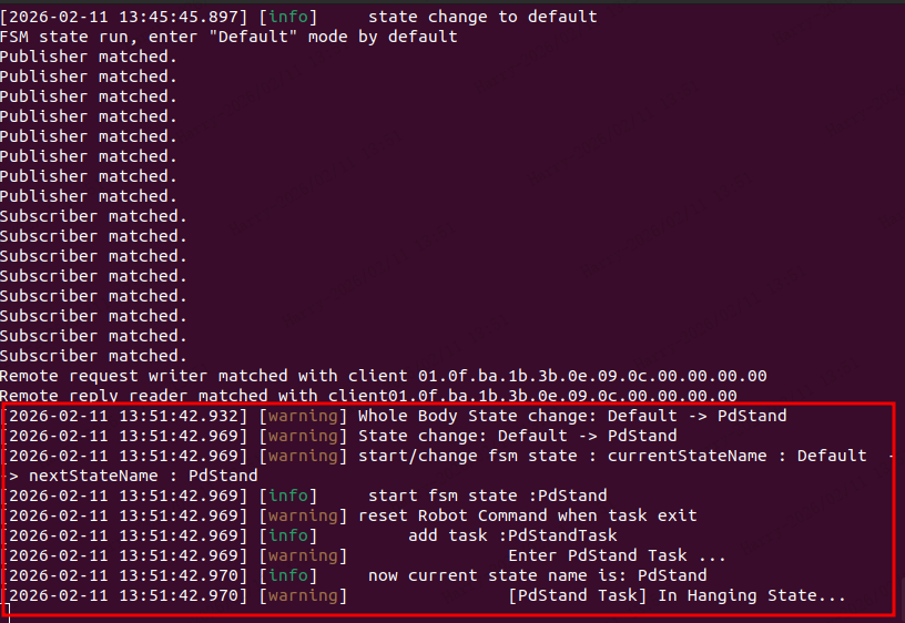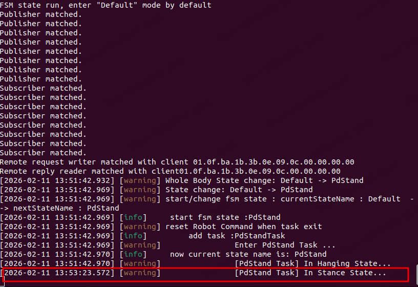 将机器人从支架上竖直放置在地面上,机器人开始站立。终端显示机器人处Stance State