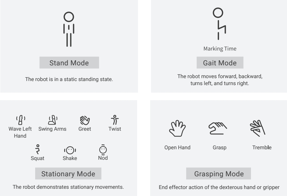 - Four Motion Modes: Standing Mode, Gait Motion Mode, In-place Motion Mode, and End-effector Grasping Mode.