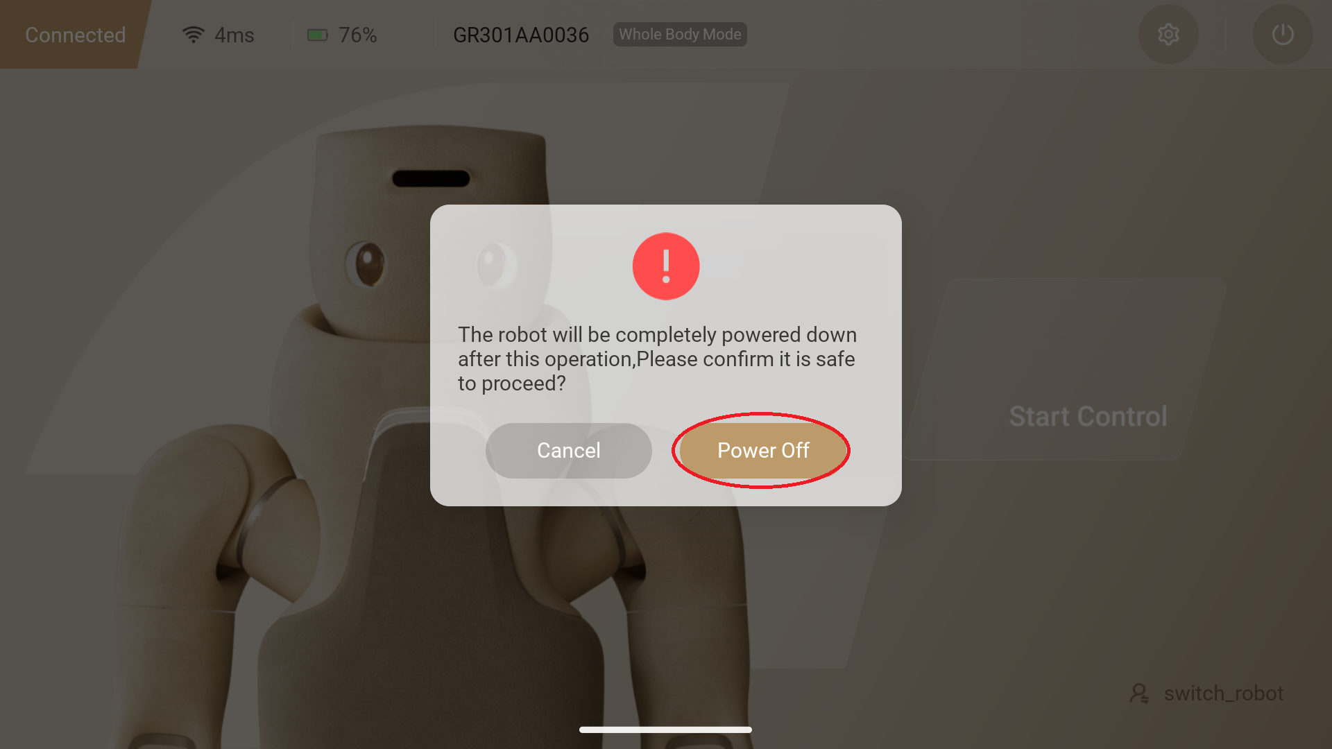 - Return to the home page, tap the "Shut Down" button on the navigation bar, and then tap the "Power Off" button on the pop-up prompt. The robot will power off entirely.