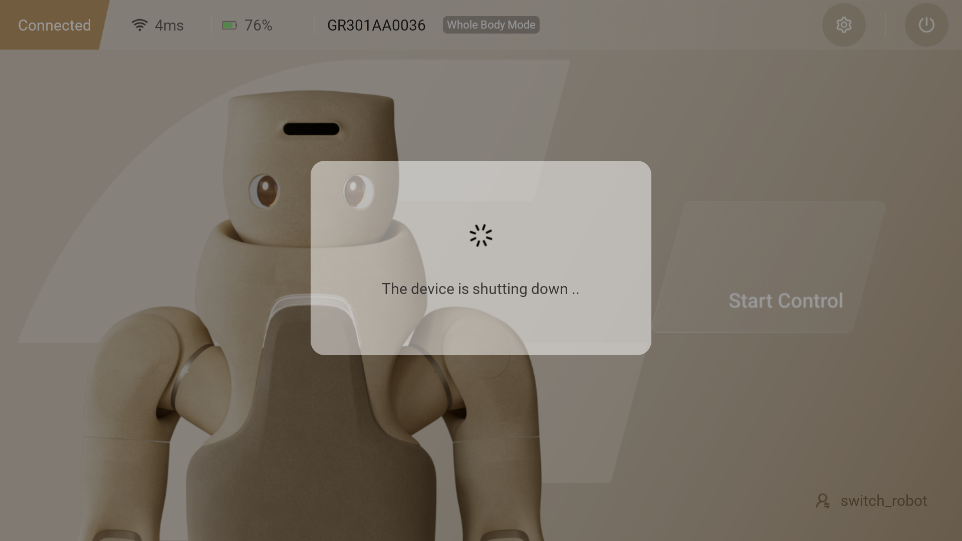- After confirming shutdown, the robot will enter the shutdown state. The pop-up window will disappear once shutdown is successfully completed.