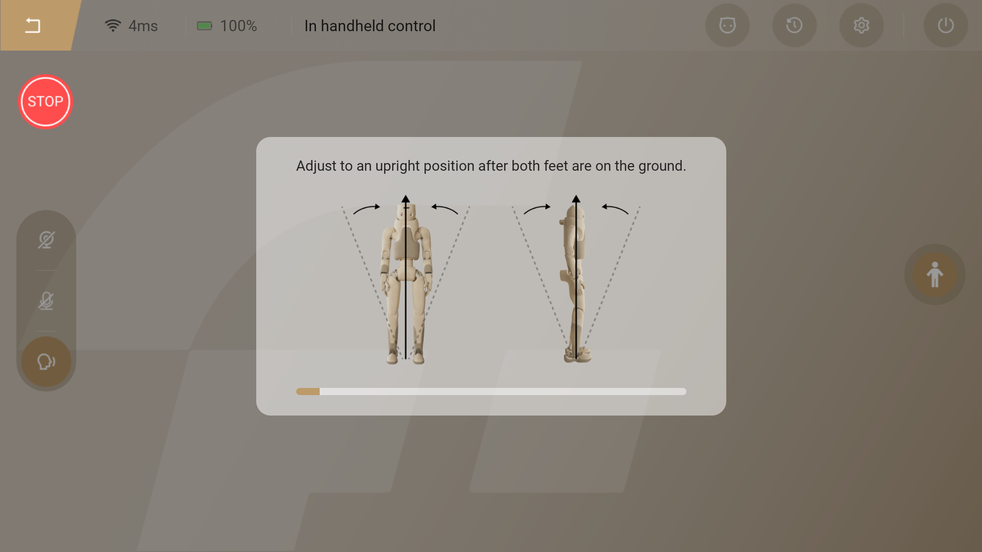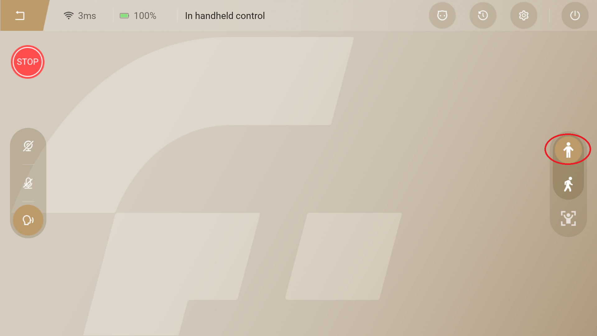 - After use, if the robot is in Whole Body Mode, tap the "Stand" button to make the robot enter the standing mode for suspension operation. (This operation is not required in Upper Body Mode as the robot is in the safety protection state.)