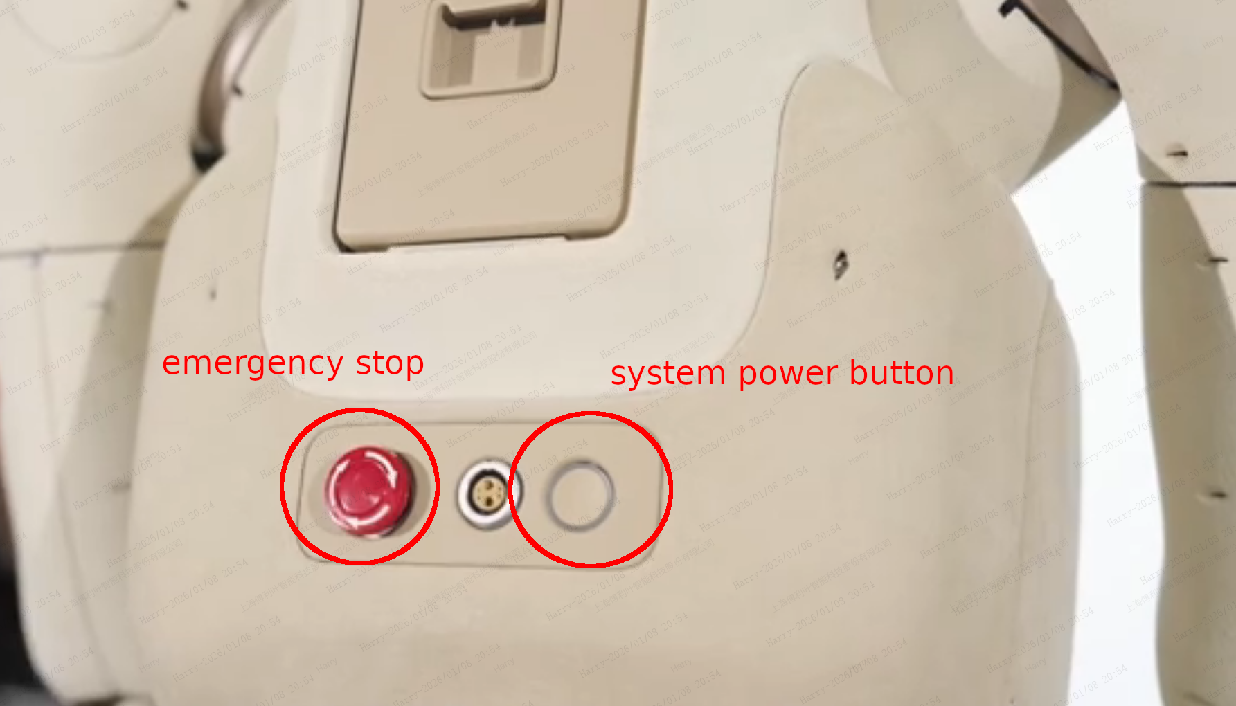 - Twist the emergency stop switch to release it, then press and hold the system power button. The indicator light will begin to flash. Observe the light on the robot's chest; release the button after the light starts flashing. At this point, the robot's arms will also perform a power-on movement.