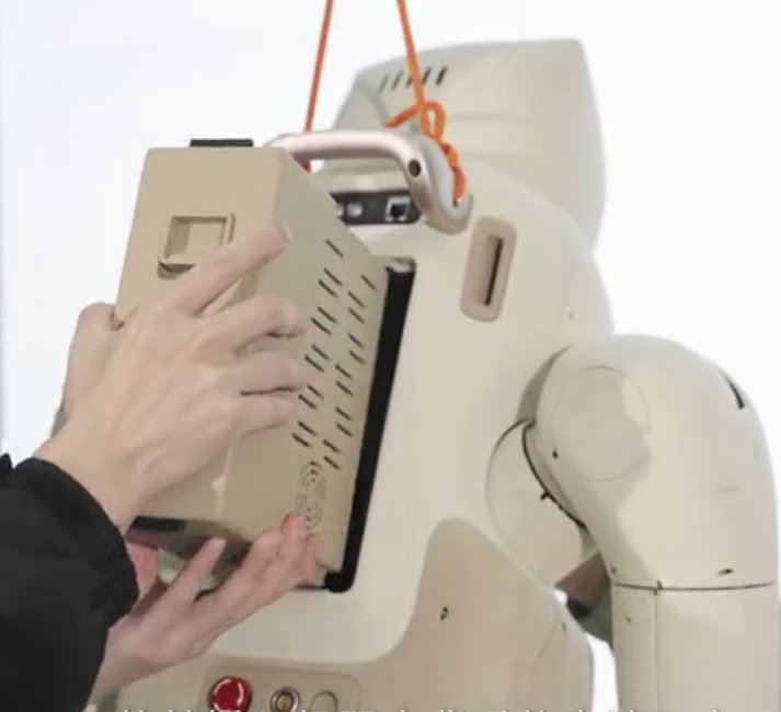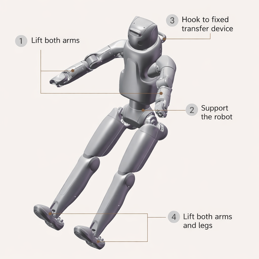 Unboxing the robot requires three people: two lift the robot's arms, while another assists in supporting the robot and fixes the hook behind the robot's neck to the transfer machine. Then, the two persons lift the robot's arms and legs, and one person presses the ascent button on the transfer machine to steadily hoist the robot out of the flight case.
