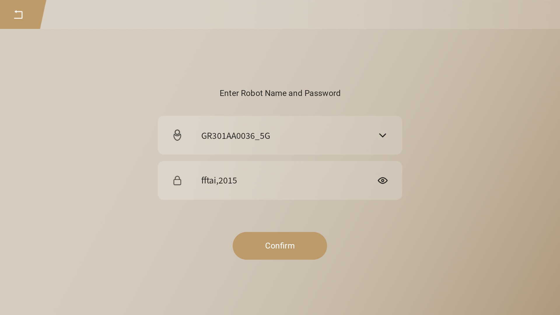 - Then enter the robot's name and password to add the robot card. The robot's name follows the format such as GR301AA0036_5G, and the password is "fftai,2015". After the robot card is successfully added, the card will be highlighted, indicating that the robot is currently in the "Connected" state. Tap "Refresh" to update the robot's connection status. (Once the robot is successfully connected, the handheld controller will automatically connect to the robot's Wi-Fi.)