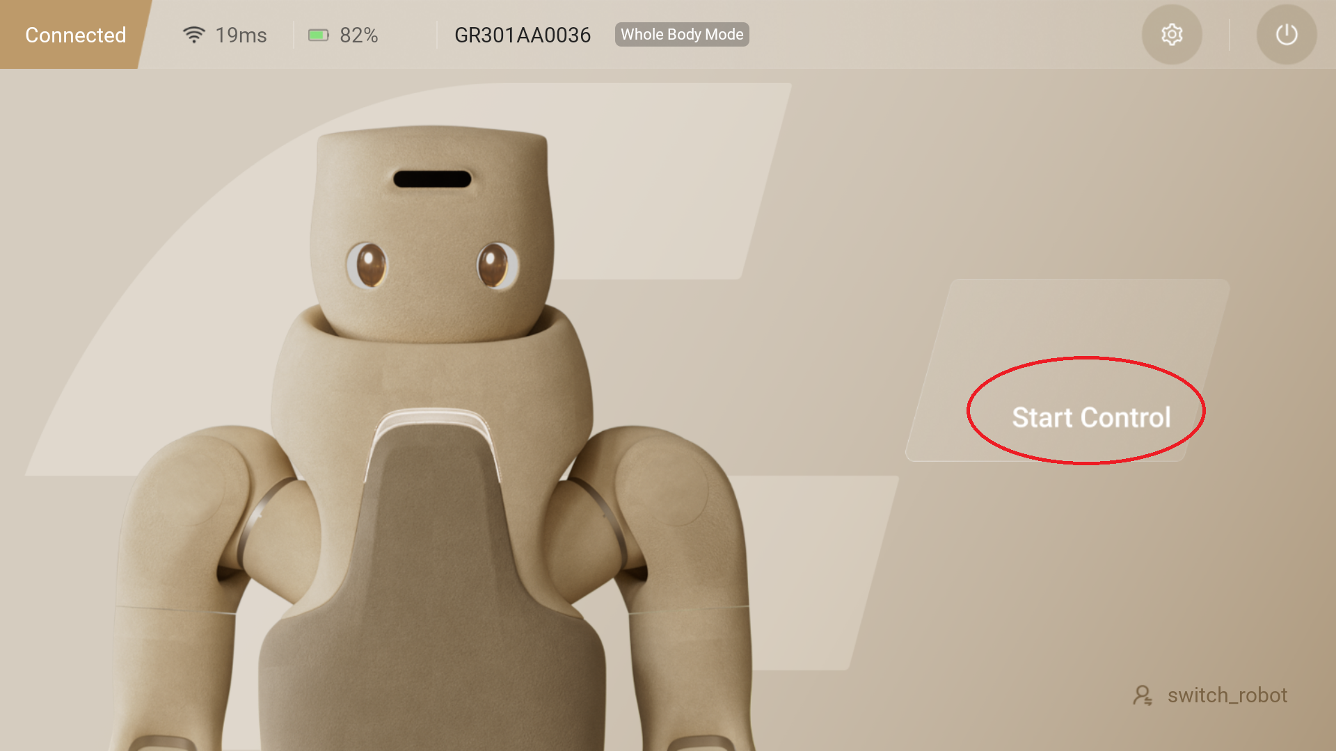 - After opening the “GR Control” app, it will automatically connect to the robot and directly enter the robot's home page. On the home page, tap the “Start Control” button to start the robot control program.